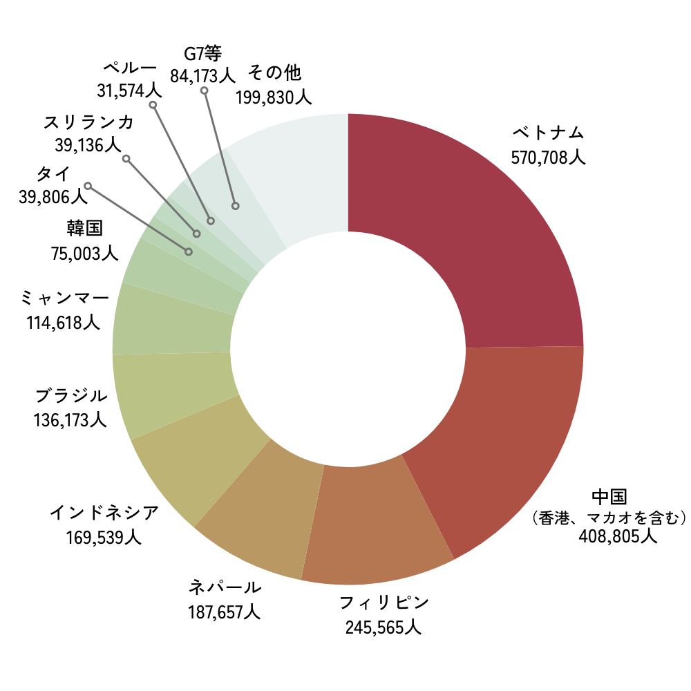 2025年時点において日本で働く外国人の国籍別構成を見ると、最も多いのはベトナム人です。