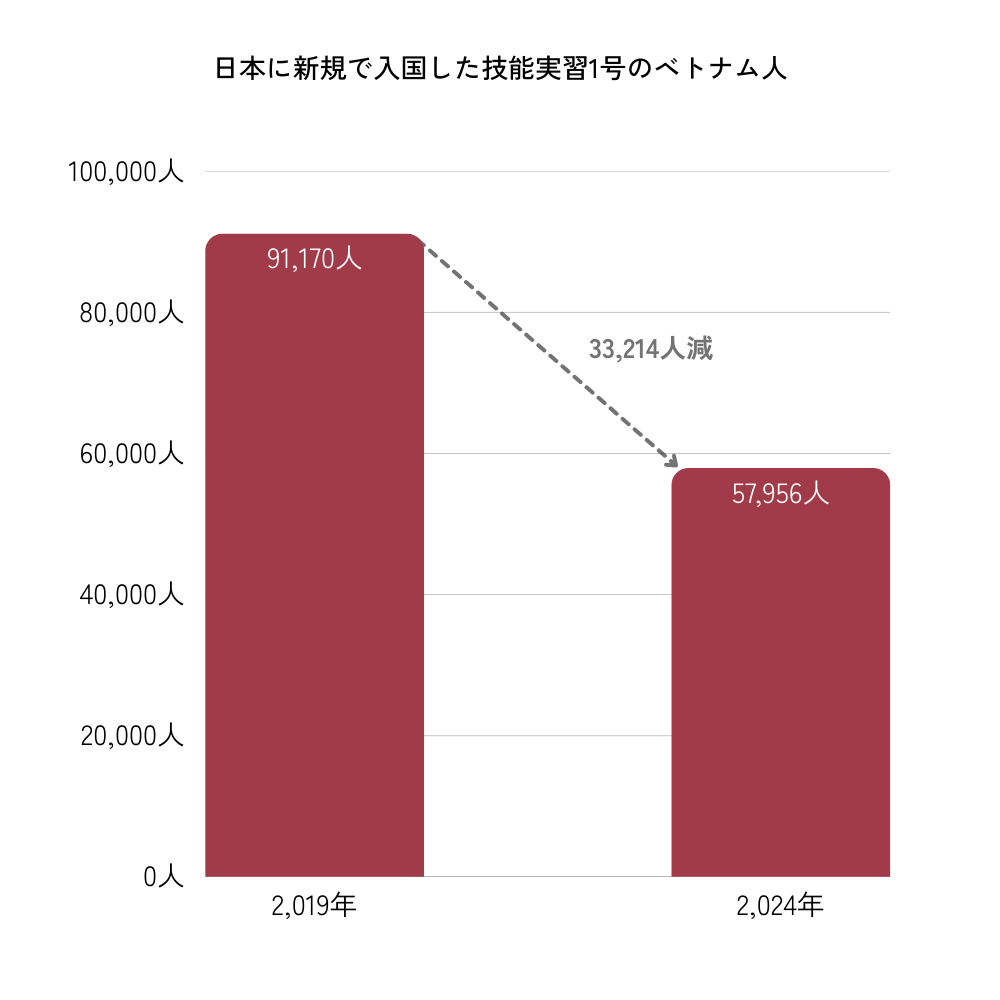 出入国管理統計によると、日本に新規で入国した技能実習1号のベトナム人は2019年には91,170人に達していましたが、その後は減少傾向が続いています。